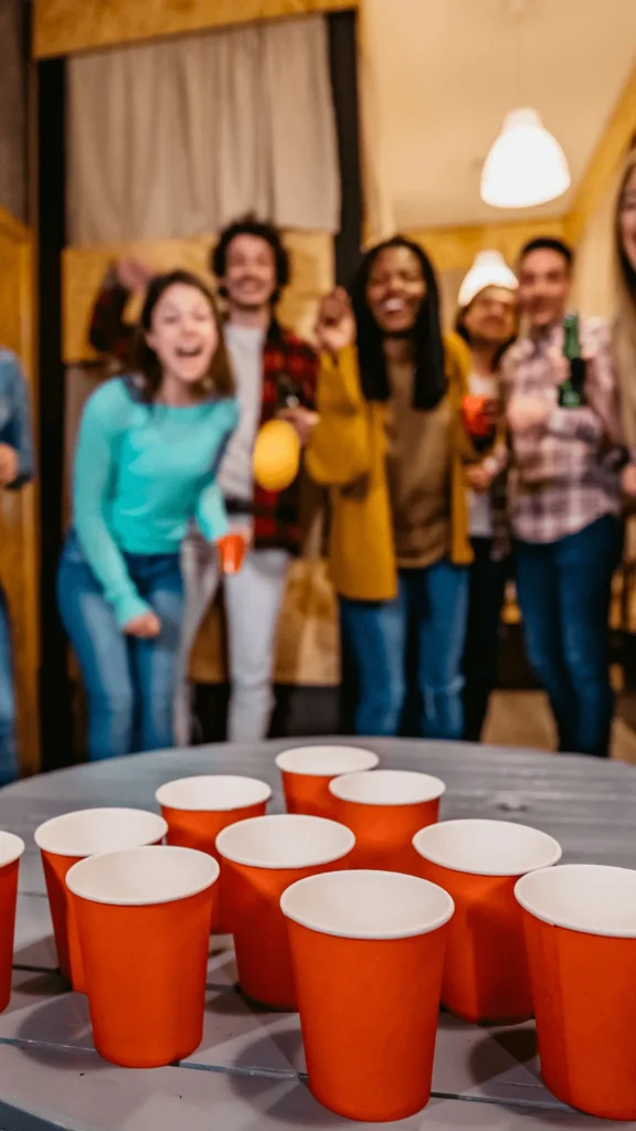 Si entra la pelota de ping pong en el vaso el otro equipo deberá beber el contenido de ese vaso, caso contrario sigue el turno al otro equipo. Gana la persona o equipo que deje al contrario sin vasos.
